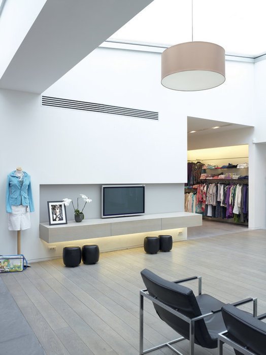 - Компоненты системы скрыты за потолком: видны только решетки для забора и подачи воздуха