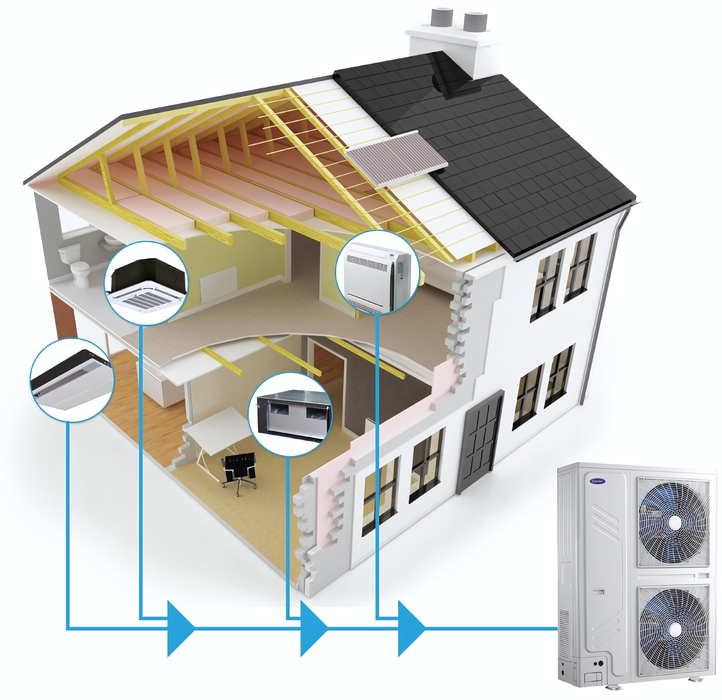 Серия Full DC Inverter VRF MINI Carrier включает в себя 12 моделей наружных блоков производительностью от 8 до 15,5 кВт (220 В, 1 фаза) и от 12 до 45 кВт (380 В, 3 фазы). Системы предназначены для коттеджей, многокомнатных квартир, офисных зданий небольшого и среднего размера. Имеет интеллектуальное управление, обеспечивающее независимый и индивидуальный контроль температуры в различных зонах.